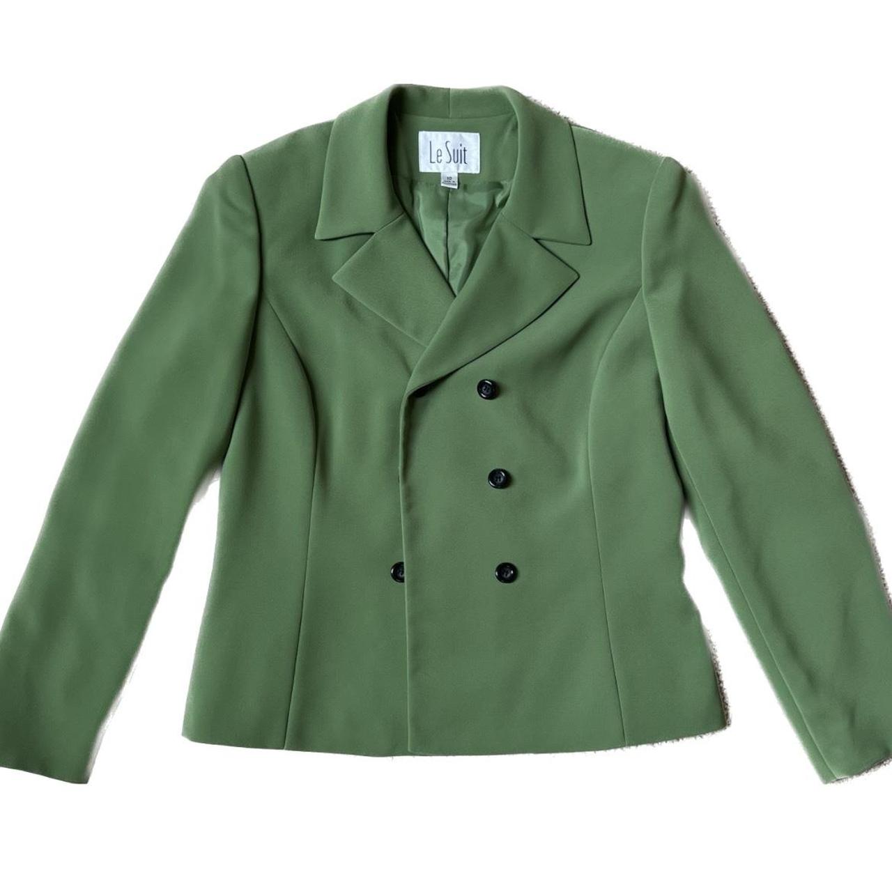 Elevate your wardrobe with this vintage power blazer from Le Suit, a striking early‑2000s piece that blends sharp tailoring with bold sophistication. Designed in a deep green tone, it features a structured double‑breasted jacket silhouette that channels confident elegance. The notched lapels add architectural precision, while the contrasting black buttons introduce a touch of retro charm and polished detail.